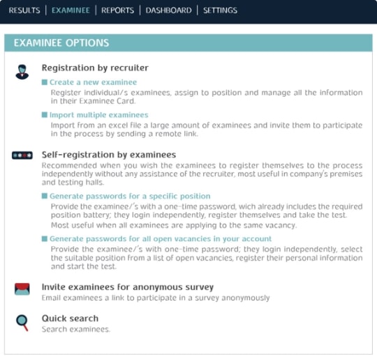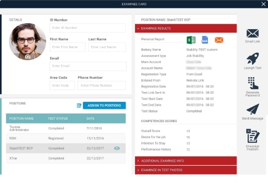 כרטיס הנבחן שלנו יאפשר לכם לעיין בכל תוצאות המבחנים , פרטי הרקע, תמונות, קבצי קורות החיים ומסמכים של הנבחנים ,כמו גם בכל הערות המגייסים והמראיינים בארגון .